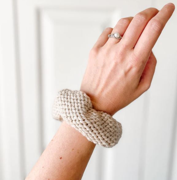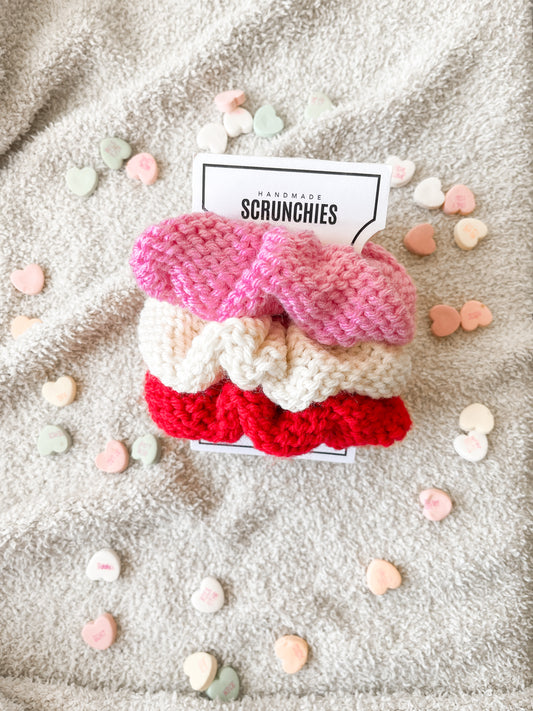 » These handmade yarn scrunchies will HOLD a special place in your heart! They're knitted with a soft, easy care acrylic yarn, then sewn around a black "ouchless" elastic hair tie.